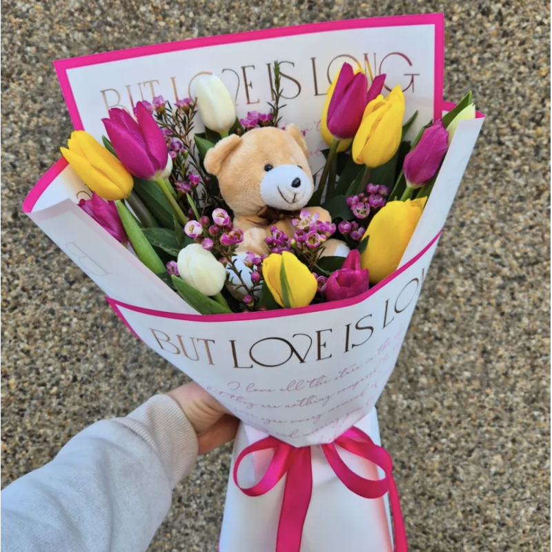 Нежна аранжировка в кутия с лалета в един цвят и плюшено зайче с дантелена рокля Лалетата могт да бъдат: жълти,розови, бели, оранжеви или друг цвят Размери: 20x25 см*размерите за приблизителни*доставки за следващия ден се извършват само на ..