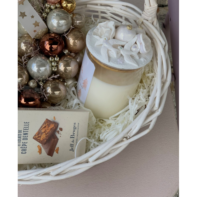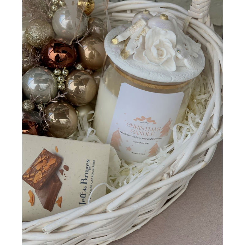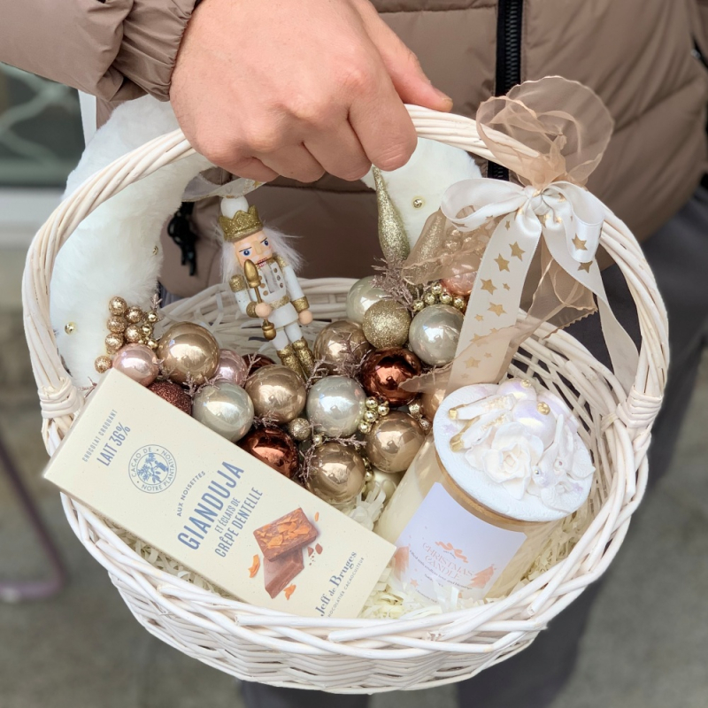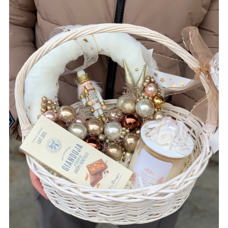 Подаръчната кощница съдържа: Бутилка бяло или друго вино Плюшен гном с височина около 25-30 смАроматна соева свещ с декорация Бонбони - 3 различни вида Ядков шоколад в бурканче Стъклени чаши - 2 брФенски макарони - 3 бр..