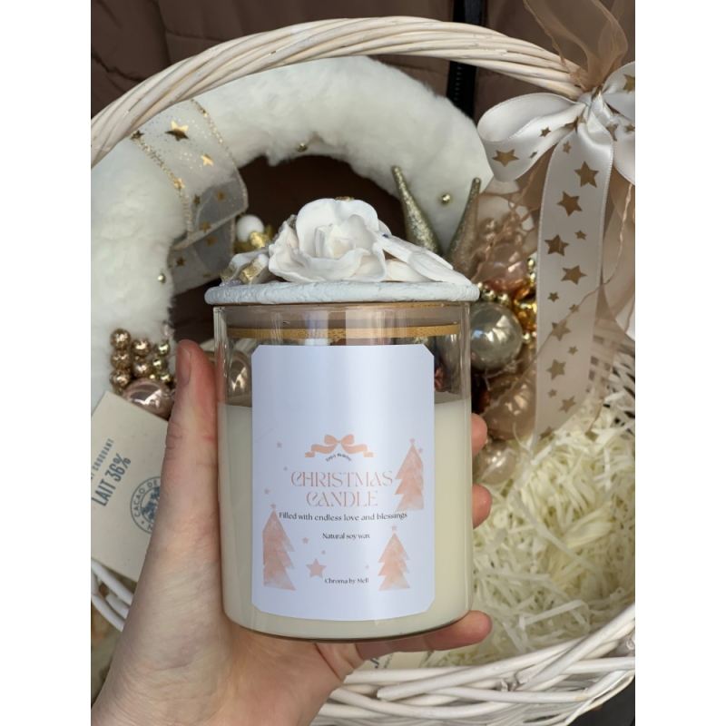 Ароматна свещ ръчно излята от 100% натурален соев восък Декорация от полимерна глинаПамучен еко фитил Аромат: коледни бисквитки Бурканче с бамбукова капачка, диаметър - 9 см, висичина - 8 см Време на горене: над 40 часа488 г..
