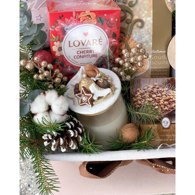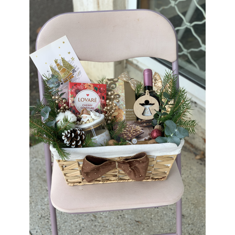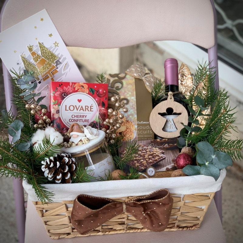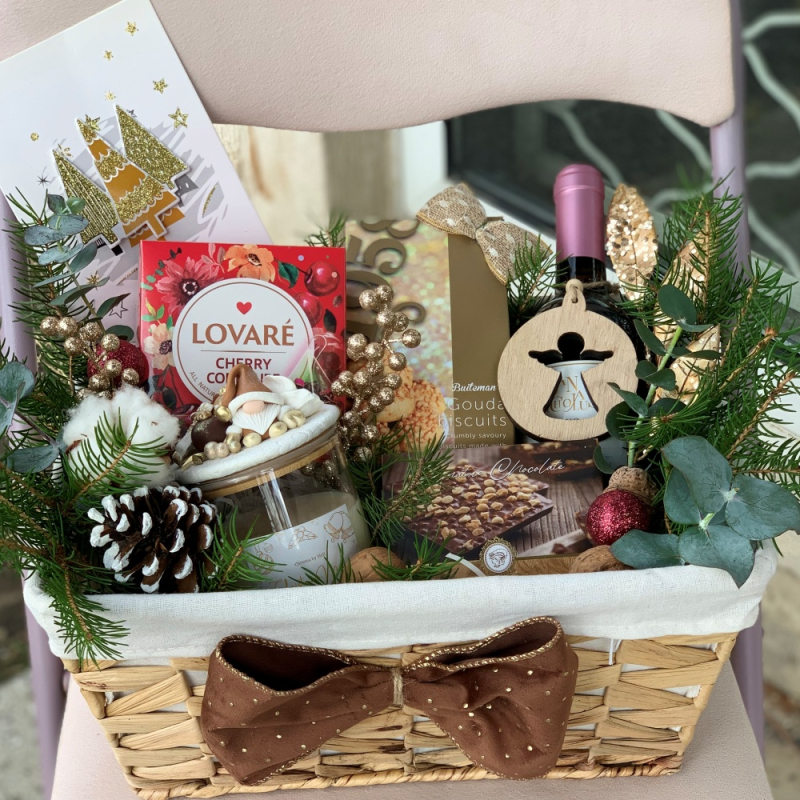 Подаръчната кощница съдържа: Бутилка бяло или друго вино Плюшен гном с височина около 25-30 смАроматна соева свещ с декорация Бонбони - 3 различни вида Ядков шоколад в бурканче Стъклени чаши - 2 брФенски макарони - 3 бр..