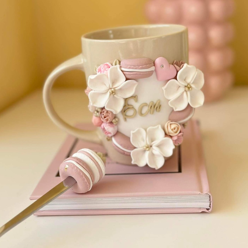 Керамична чаша с декорация от полимерна глина - име, цветя и макарони Вместимост на чашата: 300 мл Лъжичка с декорация от полимерна глина - макарони и божуриДължина на лъжичката: 16 см *Не се препоръчва употреба в съдомиялна машина и м..