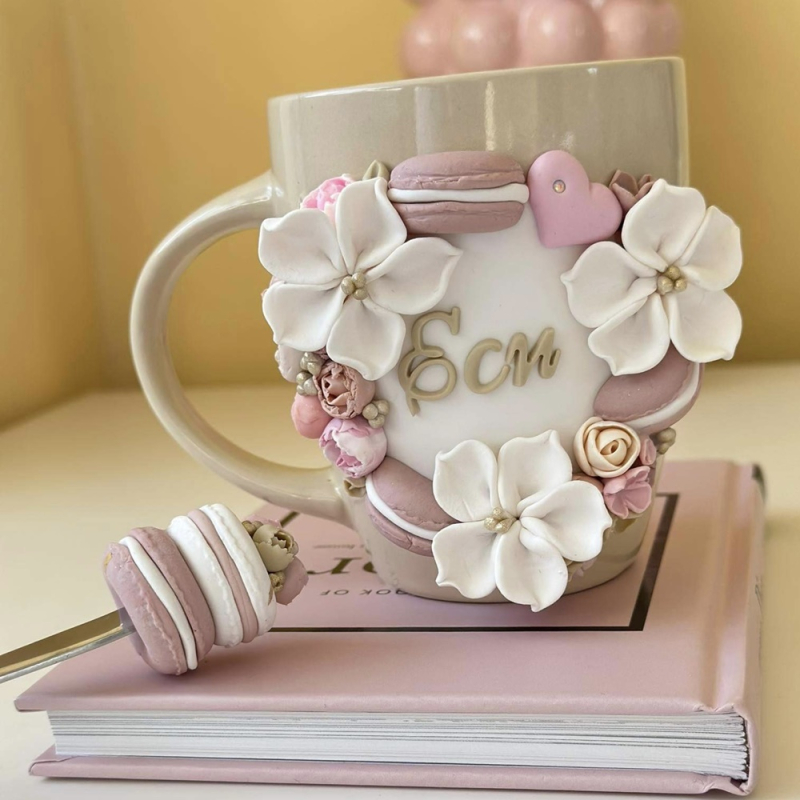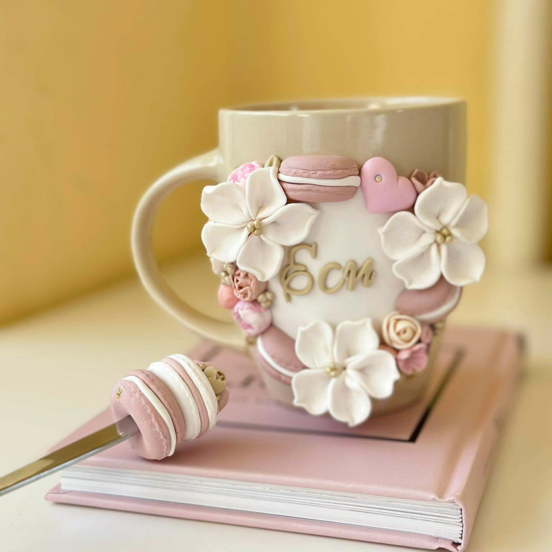 Керамична чаша с декорация от полимерна глина Вместимост: 330 мл*Не се препоръчва употреба в съдомиялна машина и микровълнова фурна *Можете да посочите желаната буква в полето с пояснения към Вашата поръчка..