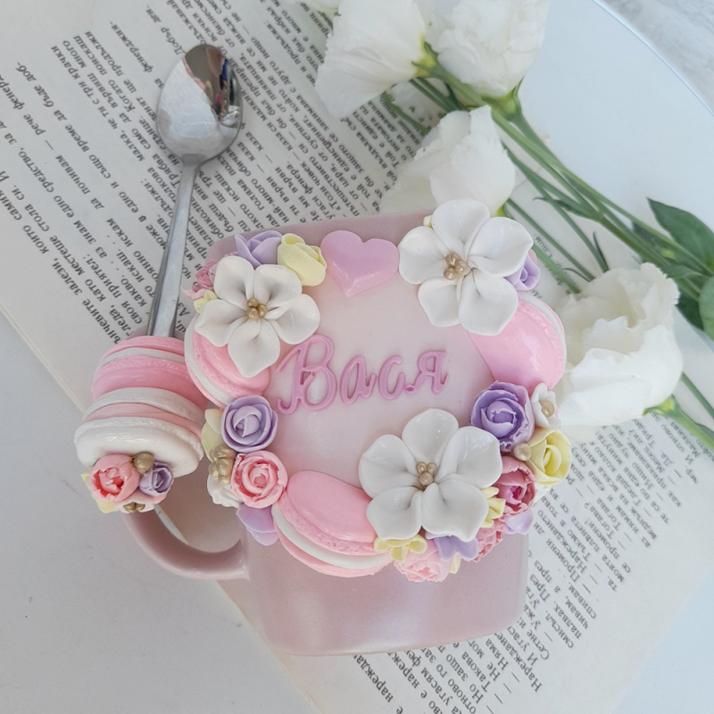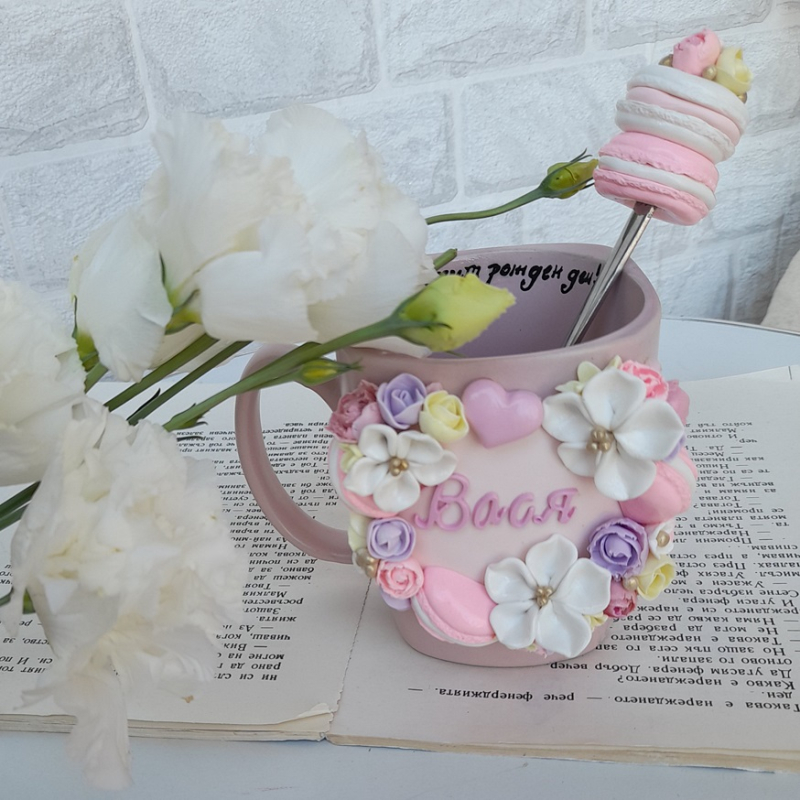 Керамична чаша с декорация от полимерна глина - име, цветя и макарони