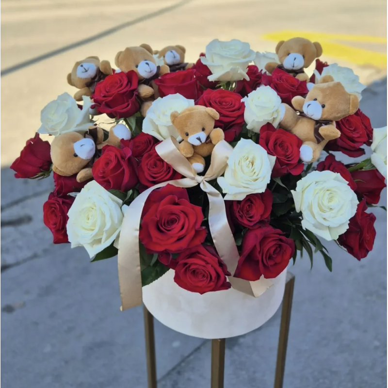 Съчетание на най-красивите розови божури с нежна бяла роза, орхидея и малко мече за акцентКутия в цвят мента с розова лента от сатен Размери на аранжировката: около 50х40 см..