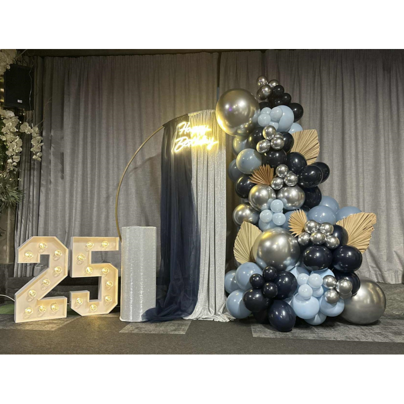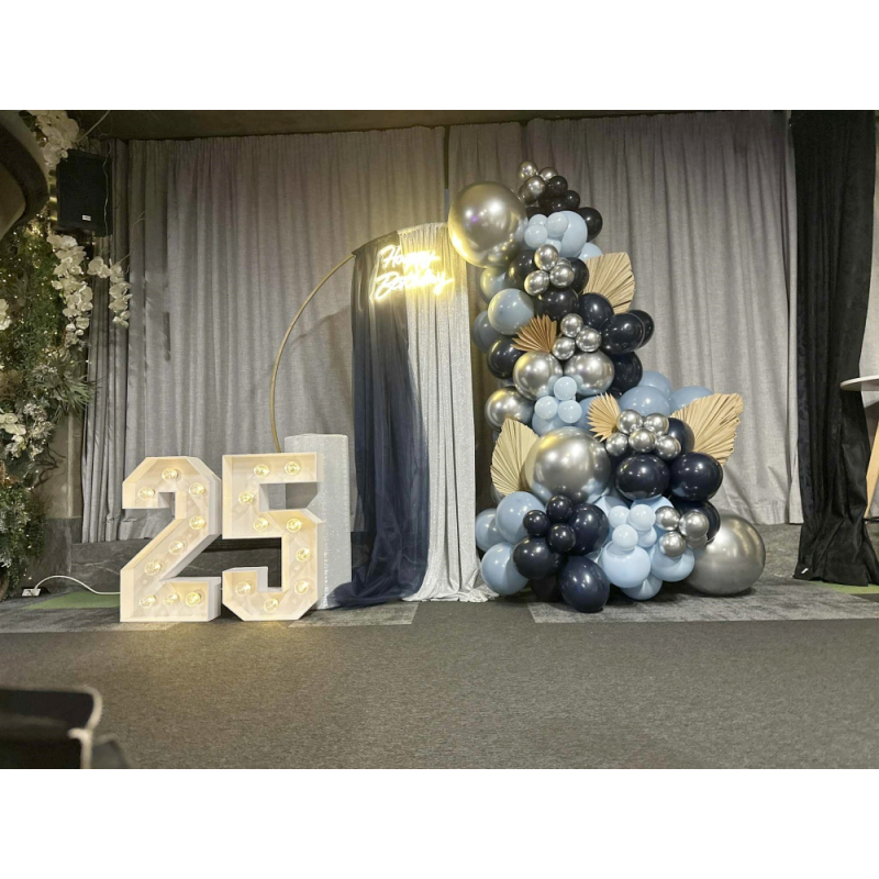 Балони в тъмни синьо, светло синьо, сребърно и още един нюанс синьо